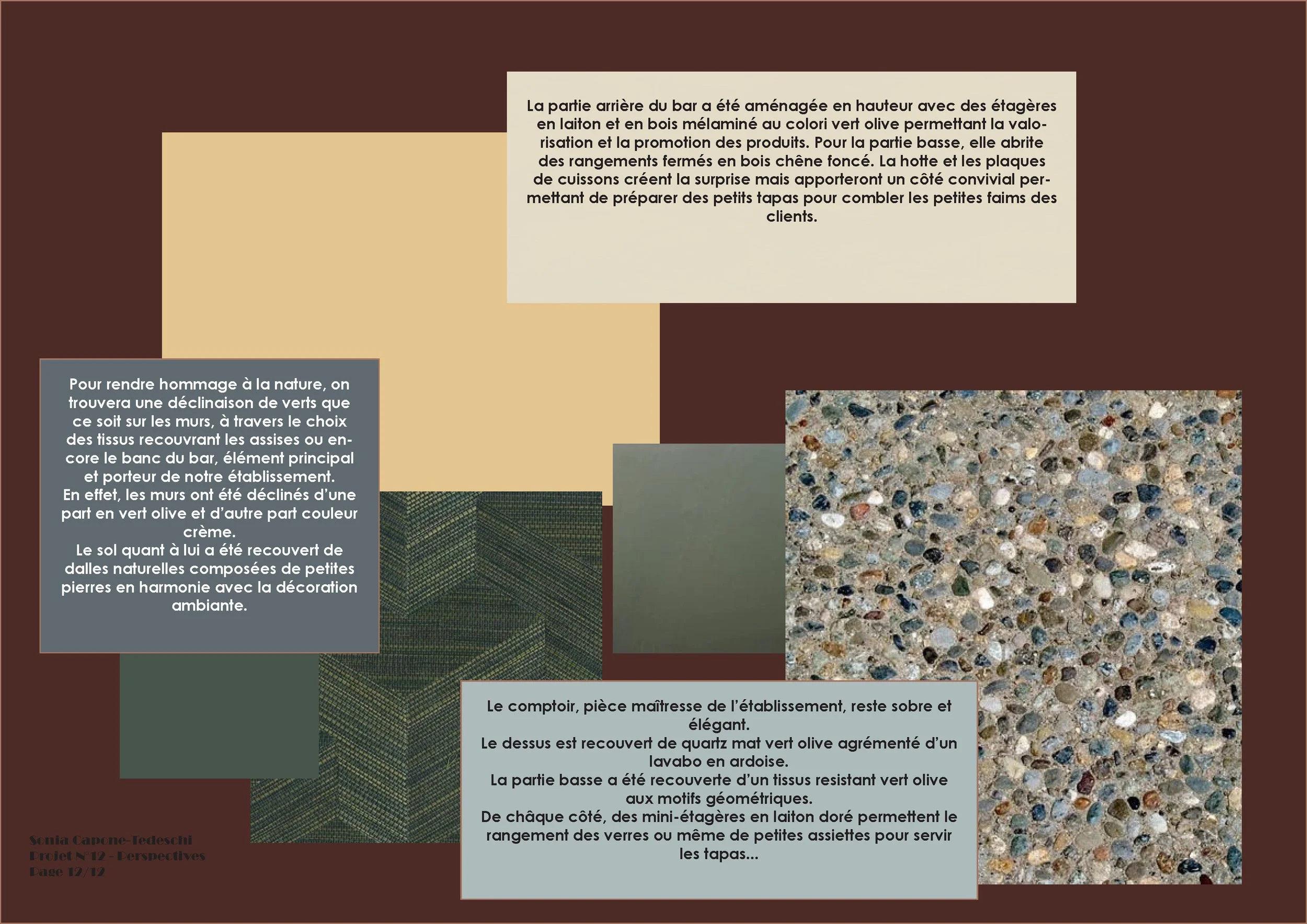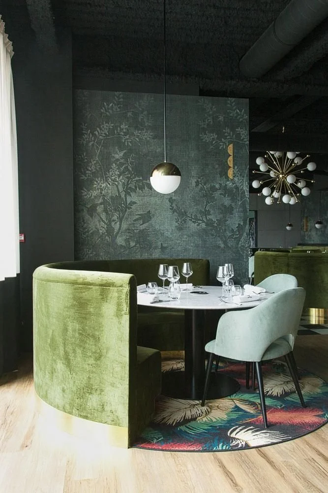 L’agencement des assises a été pensé pour offrir confort et polyvalence. Banquettes conviviales, chaises pour le travail ou la détente, chaises hautes pour les moments pressés et canapés pour se relaxer, toutes respectent une harmonie de couleurs autour du vert, du bois et du laiton. Les tissus sélectionnés, aux motifs hexagonaux ou aux rayures dorées, apportent chaleur et raffinement tout en évoquant les terres ensoleillées du Sud.